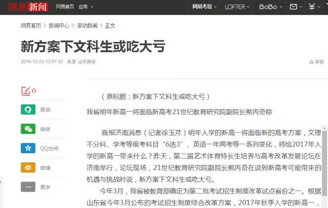 網(wǎng)易新聞連發(fā)兩文,引用《都市女報(bào)》、《山東商報(bào)》對(duì)于論壇的報(bào)道,指出新高考改革方案文科生或吃大虧。